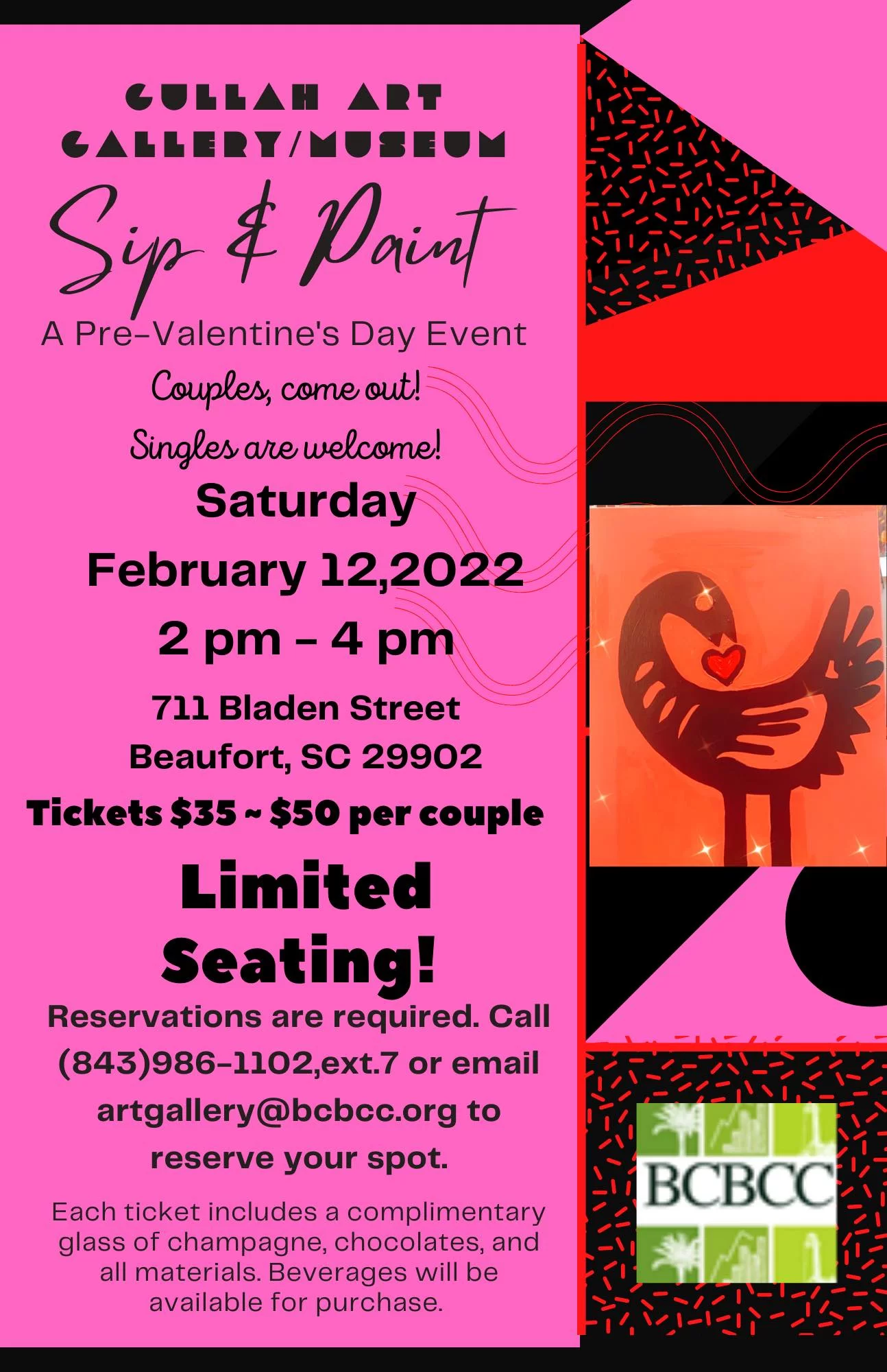 Please join us for a FUN time at our upcoming Paint n Sip event at the Gullah Art Gallery on Saturday, February 12, from 2pm to 4pm, and learn some basic principles of art and color composition while enjoying an afternoon with friends. Step by step we will help you create your own one of a kind piece of artwork to take home!