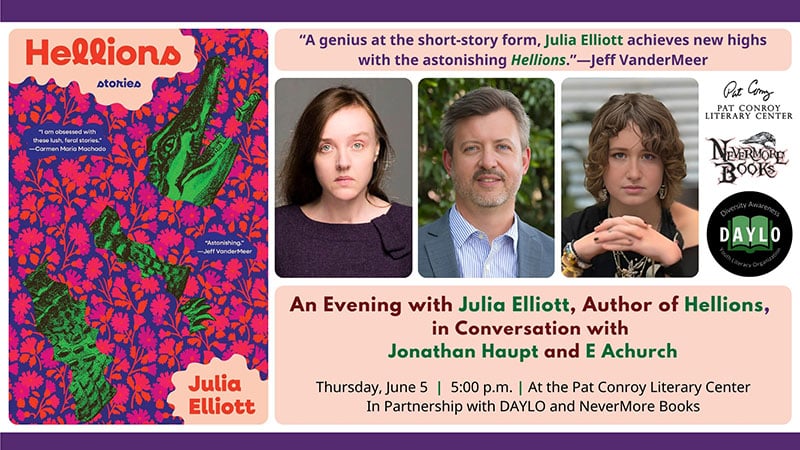 The nonprofit Pat Conroy Literary Center, in partnership with NeverMore Books, will host an evening with acclaimed fiction writer Julia Elliott, author of the newly published story collection Hellions—named a TIME Best Book of the Month and a Lit Hub Most Anticipated Book of the Year—on Thursday, June 5, at 5:00 p.m., at the Conroy Center (601 Bladen St., Beaufort). Elliott will be in conversation with Conroy Center executive director Jonathan Haupt and DAYLO student leader E Achurch.