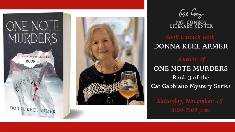 The nonprofit Pat Conroy Literary Center is honored to host the book launch event for Donna Keel Armer’s One Note Murders ~ Book #3 in the Cat Gabbiano Mystery Series. Join us on Saturday, November 15, from 5:00 to 7:00 p.m. at 601 Bladen St., in downtown Beaufort. Free and open to the public; no advance registration required. Books will be available for sale and signing. Refreshments will be provided. The author will be in conversation with Pat Conroy Literary Center executive director Jonathan Haupt from 5:30 to 6:00 p.m. Books will be available for sale and signing before and after the brief program.
