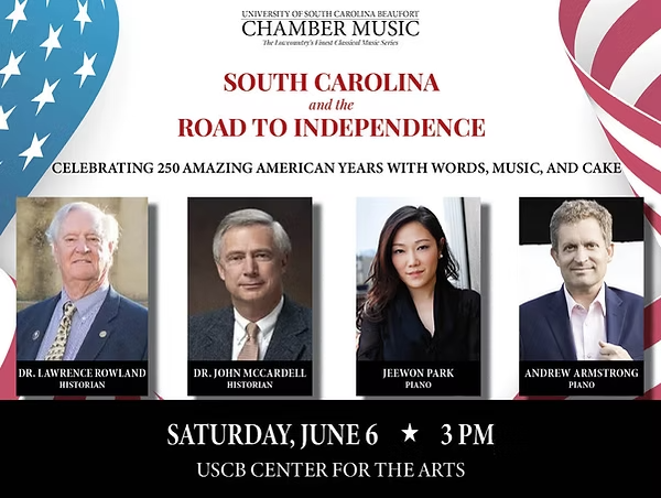 The decision to declare independence was bold and risky, and the out-come far from certain.  In 1776 no one in the colonies was more motivated or more determined to rise to the challenges that lay ahead than the patriots of South Carolina.  On June 6, 2026, no one will commemorate their success with greater joy and enthusiasm than the citizens of the South Carolina lowcountry who gather at the USCB Center for Arts in historic Beaufort for a day of history, music, and birthday cake. The program will comprise three parts: a combined lecture by eminent historians Drs. Lawrence Rowland and John McCardell-tracing the sources and discussing the causes of the American Revolution and South Carolina’s role in its success, a short break for discussion and the essential birthday cake with lemonade, and then an all American concert for four hands by brilliant pianists Jeewon Park and Andrew Armstrong-presenting works by American composers ranging from Sousa to Joplin to Gershwin to Barber; from “Yankee Doodle” to “Stars and Stripes” to ragtime, to “Rhapsody in Blue,” and beyond.