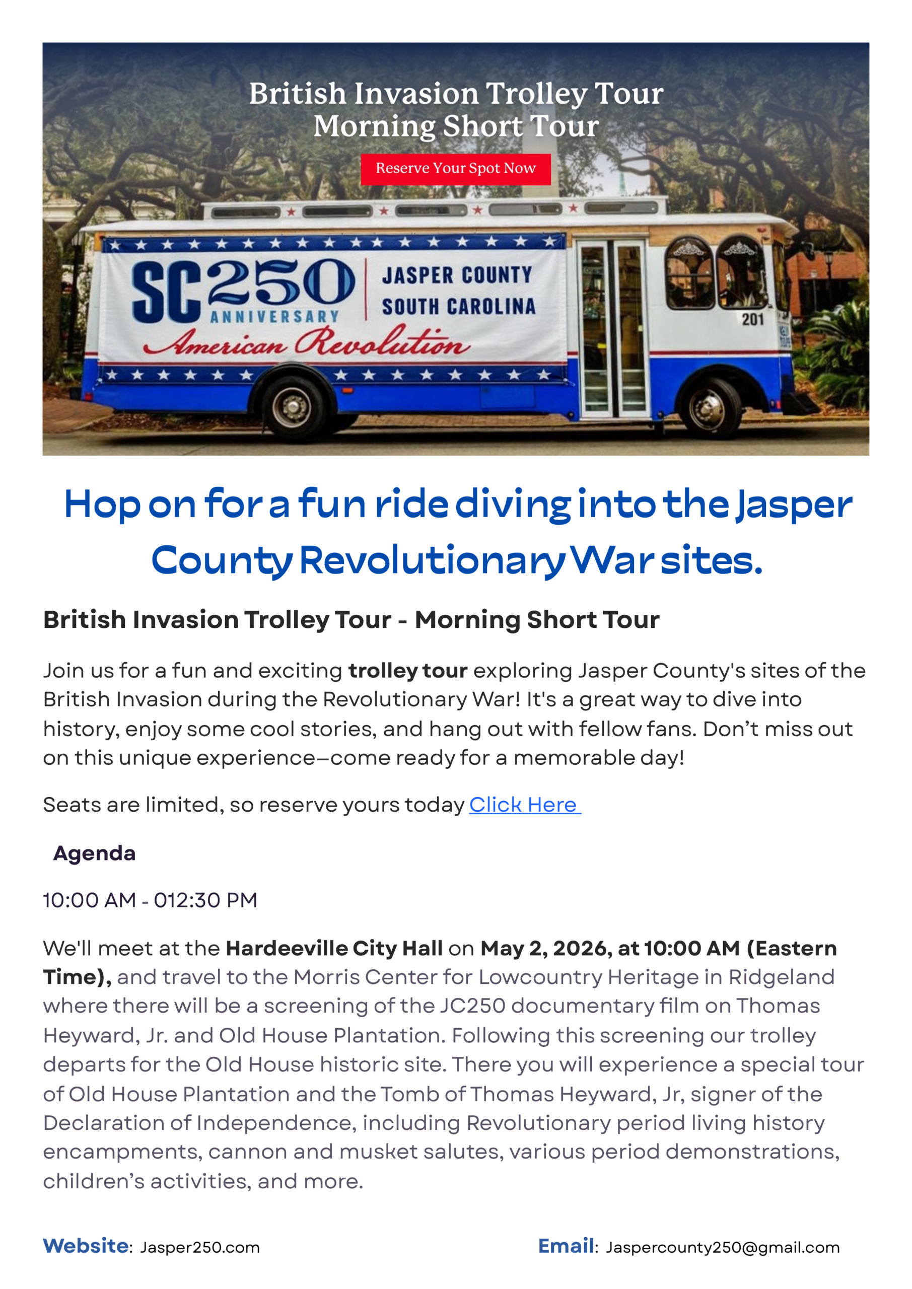 Join us for a fun and exciting trolley tour exploring Jasper County’s sites of the British Invasion during the Revolutionary War! It’s a great way to dive into history, enjoy some cool stories, and hang out with fellow fans. Don’t miss out on this unique experience—come ready for a memorable day!