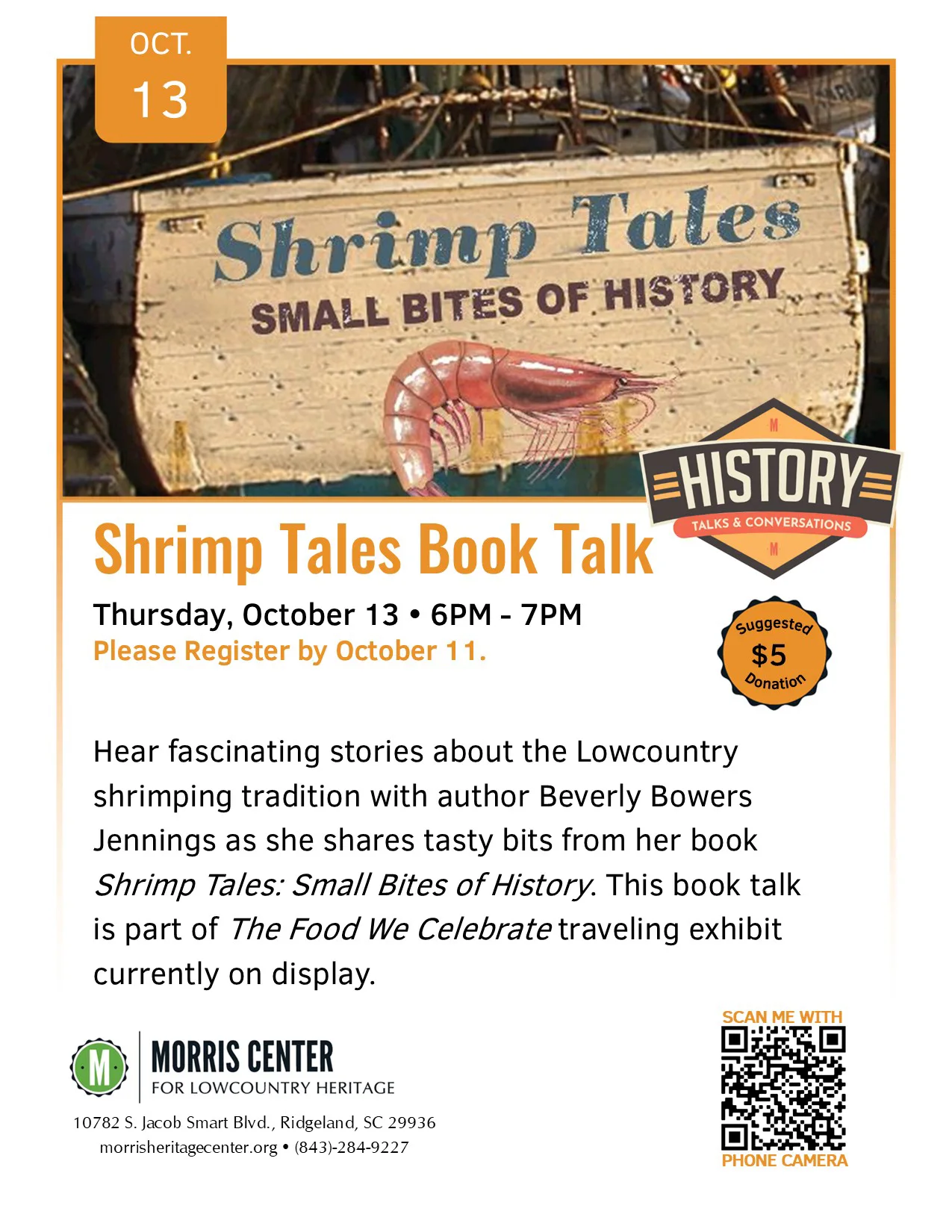 Hear fascinating stories about the Lowcountry shrimping tradition with author Beverly Bowers Jennings as she shares tasty bits from her book Shrimp Tales: Small Bites of History. This book talk is part of The Goof We Celebrate traveling exhibit currently on display.