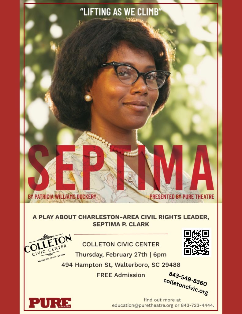 Join us in celebrating Black History Month with a free production about the Lowcountry’s own, Septima Clark. Charleston’s PURE Theatre bring the story of this amazing educator and civil rights activist/leader to life on the Hampton St. Auditorium stage at the Colleton Civic Center, Thursday, February 27th at 6. Call 843-549-8360 for more information.