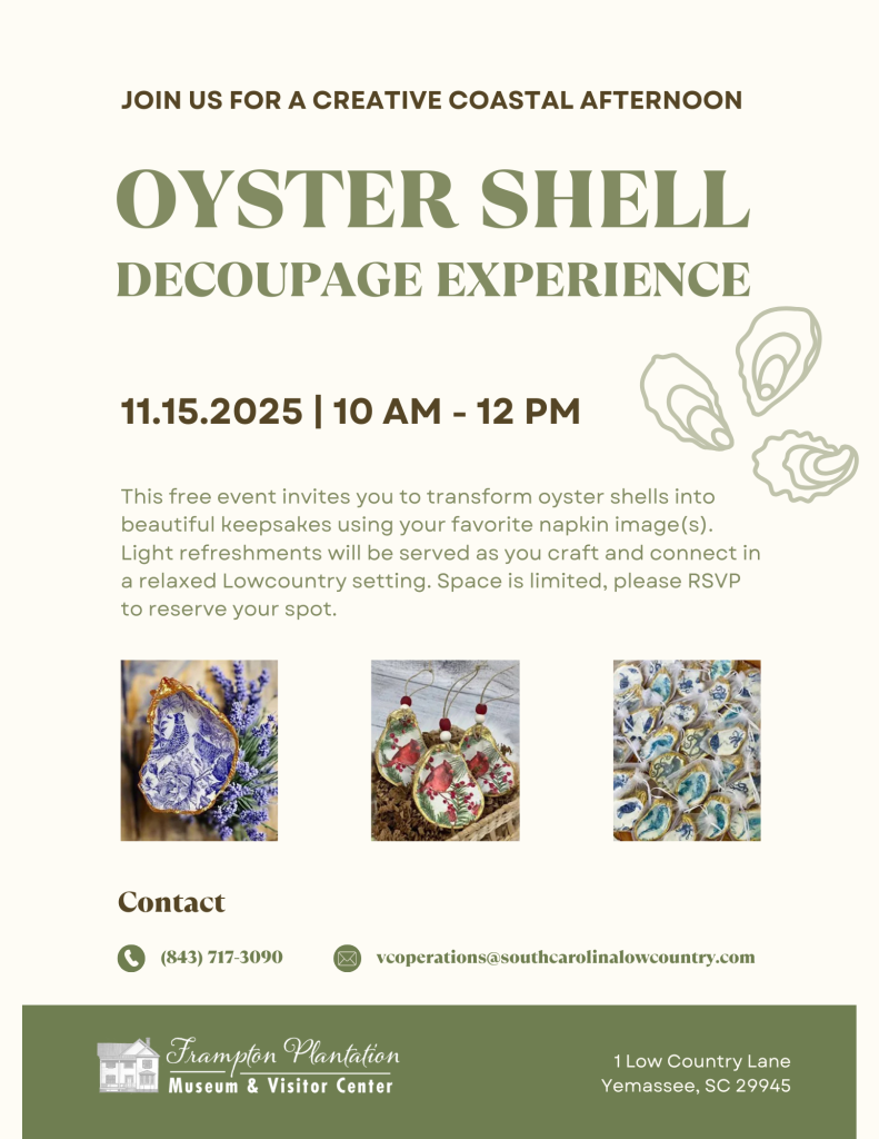 Come join the Frampton Plantation Staff as they lead a class on how to decoupage oyster shells. This free event invites you to transform oyster shells into beautiful keepsakes using your favorite napkin image(s). Light refreshments will be served as you craft and connect in a relaxed Lowcountry setting. Space is limited, please RSVP to reserve your spot, (843)717-3090.